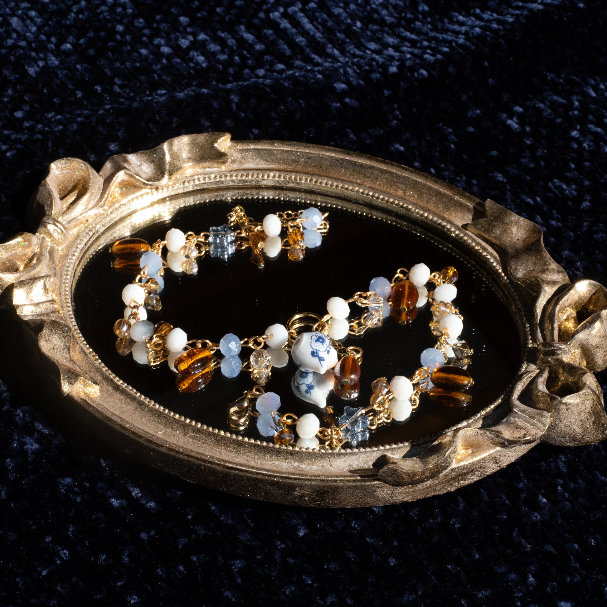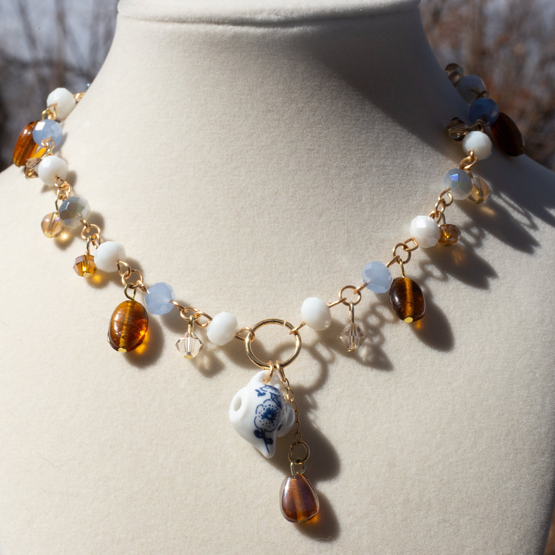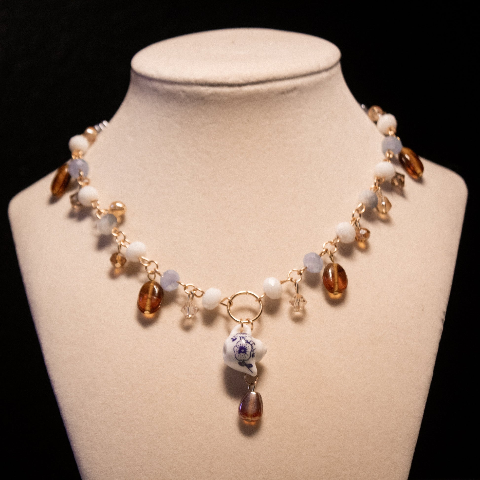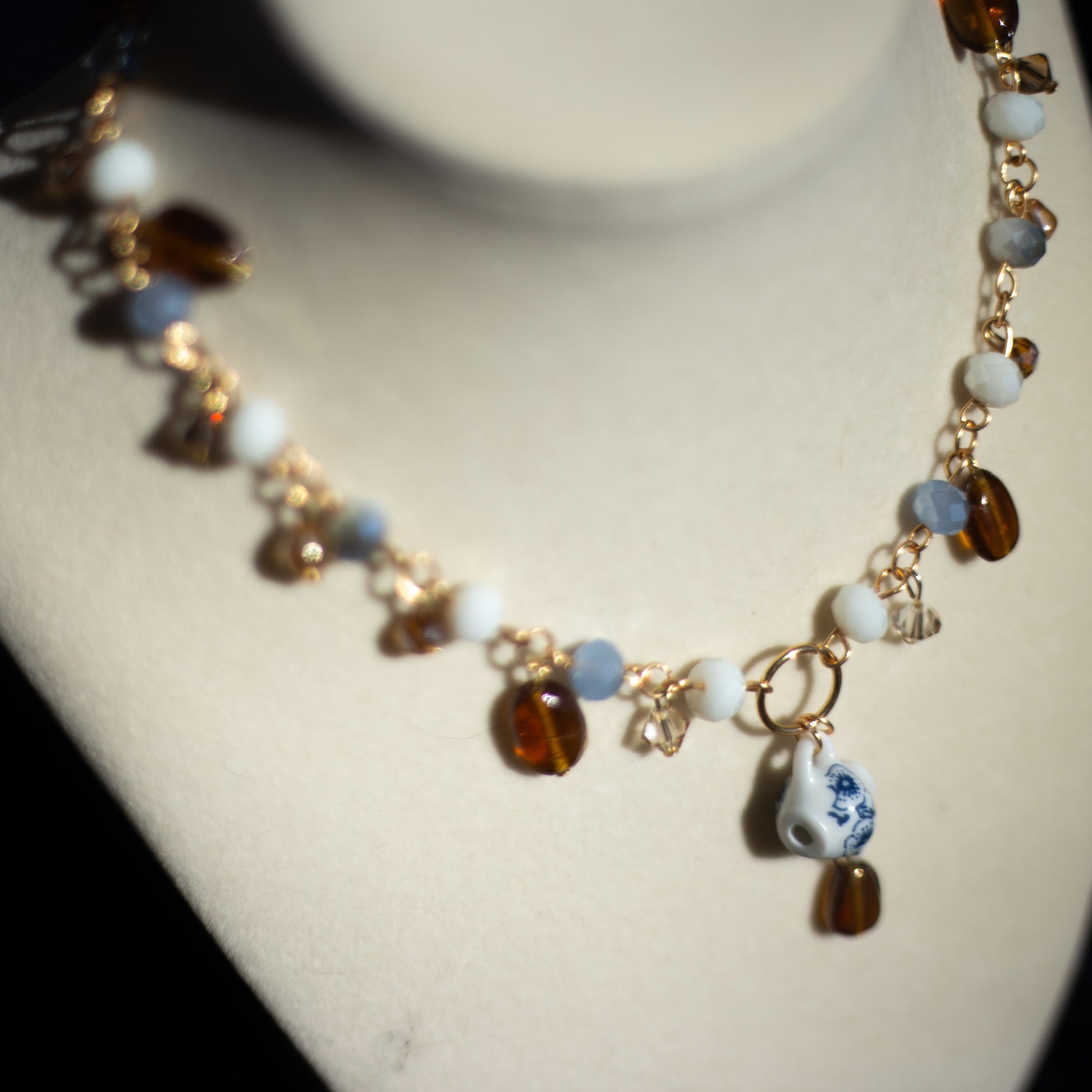 made with; tarnish proof wire, glass & acrylic beads, ceramic teapot charm & 💕