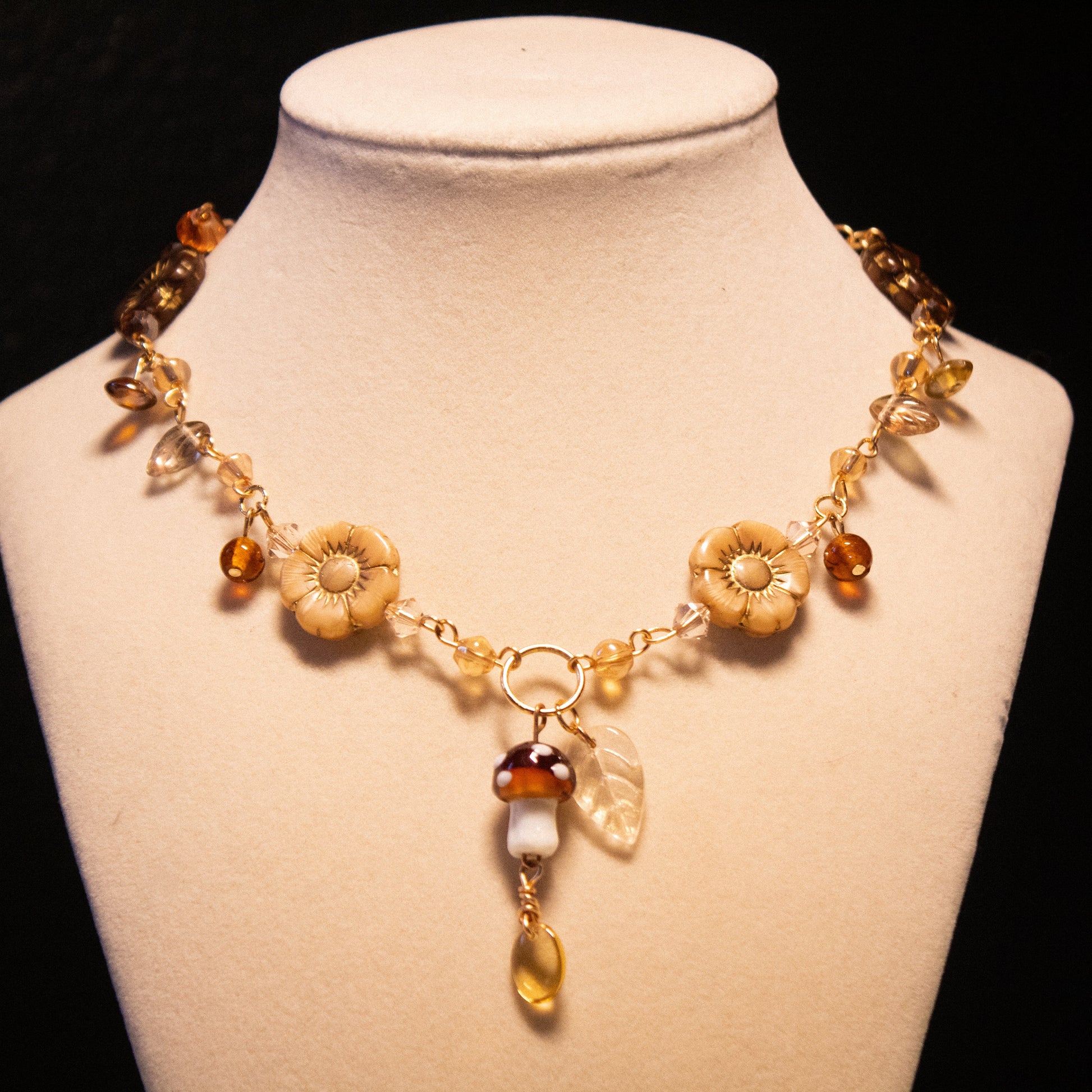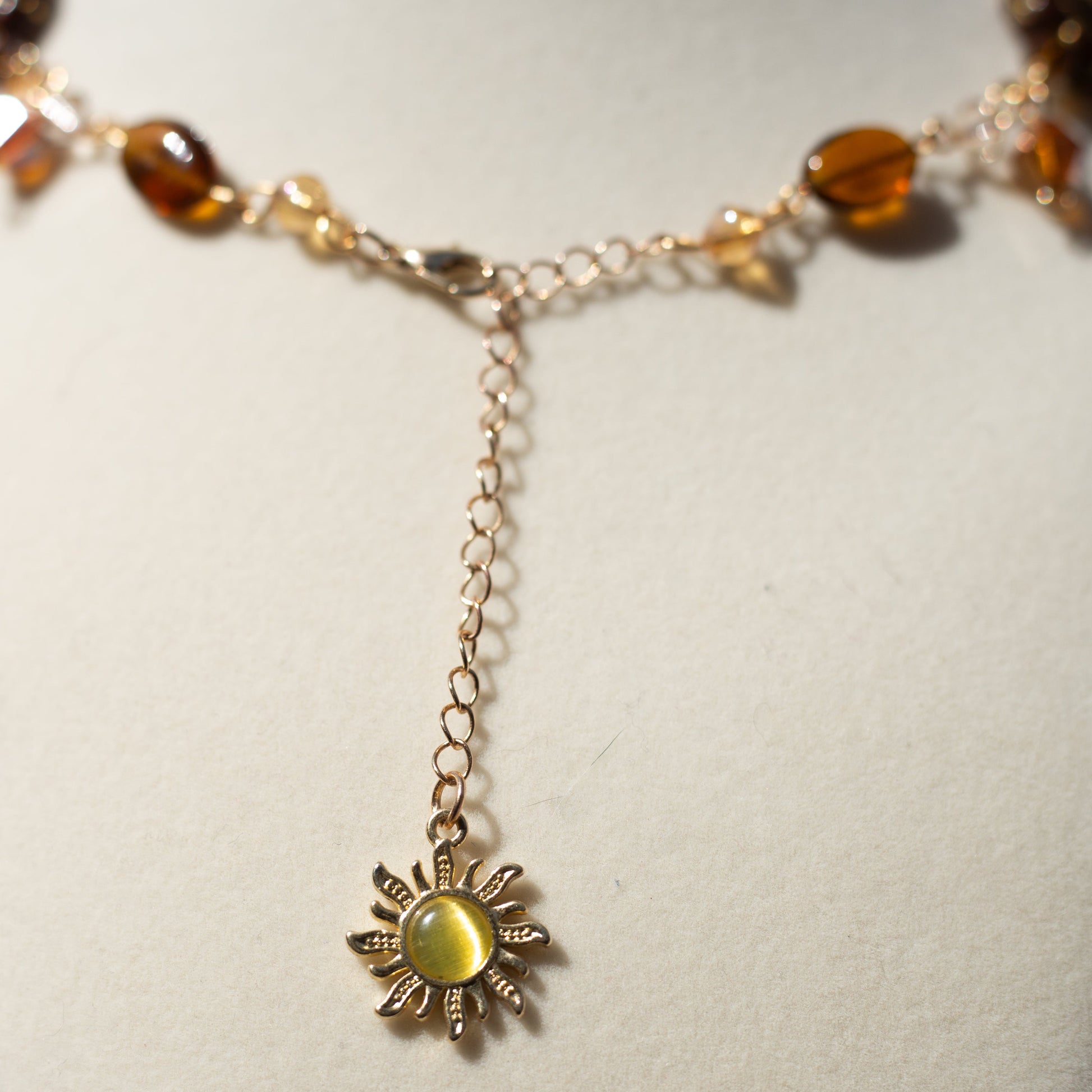 made with; tarnish proof wire, glass & acrylic beads, metal suncharm &🧡